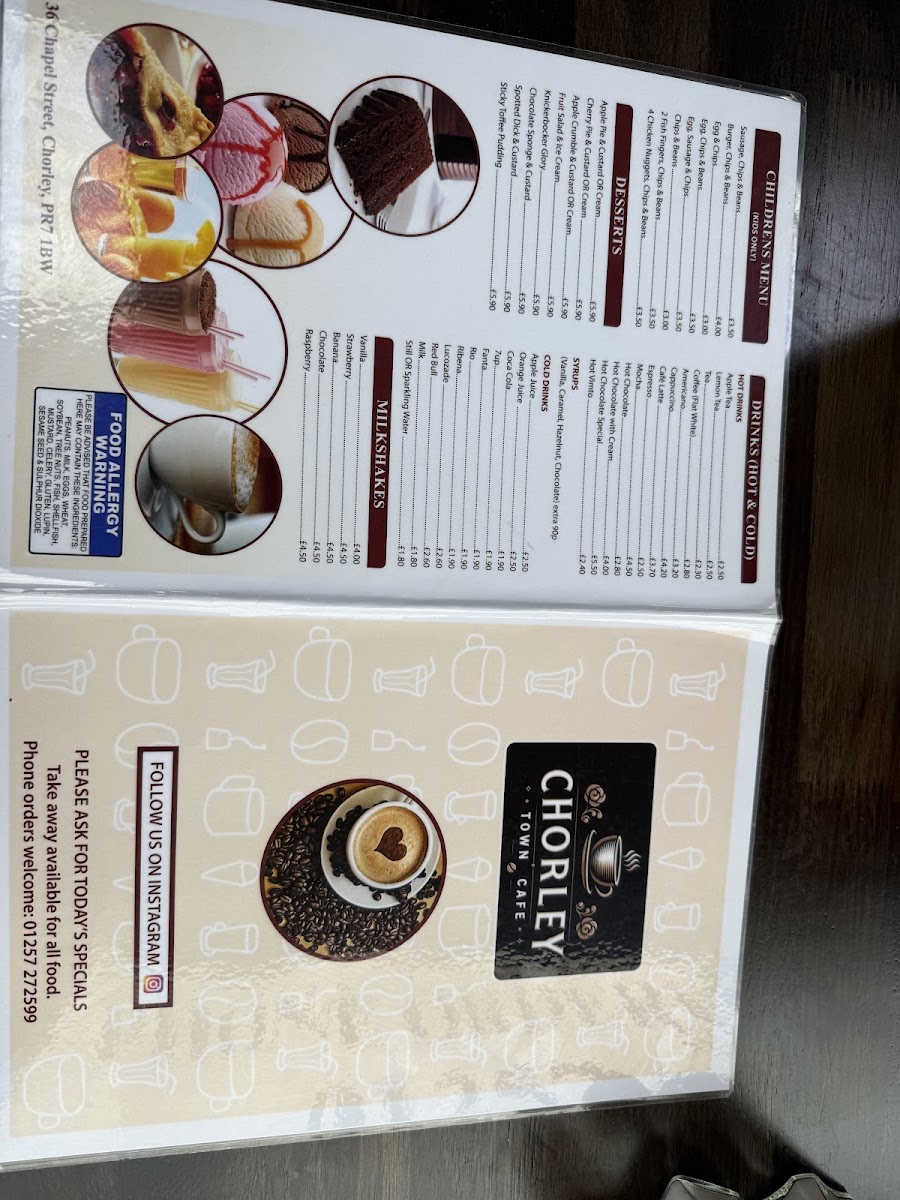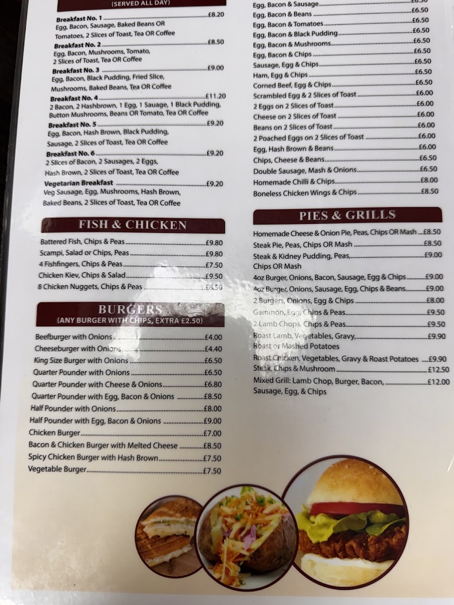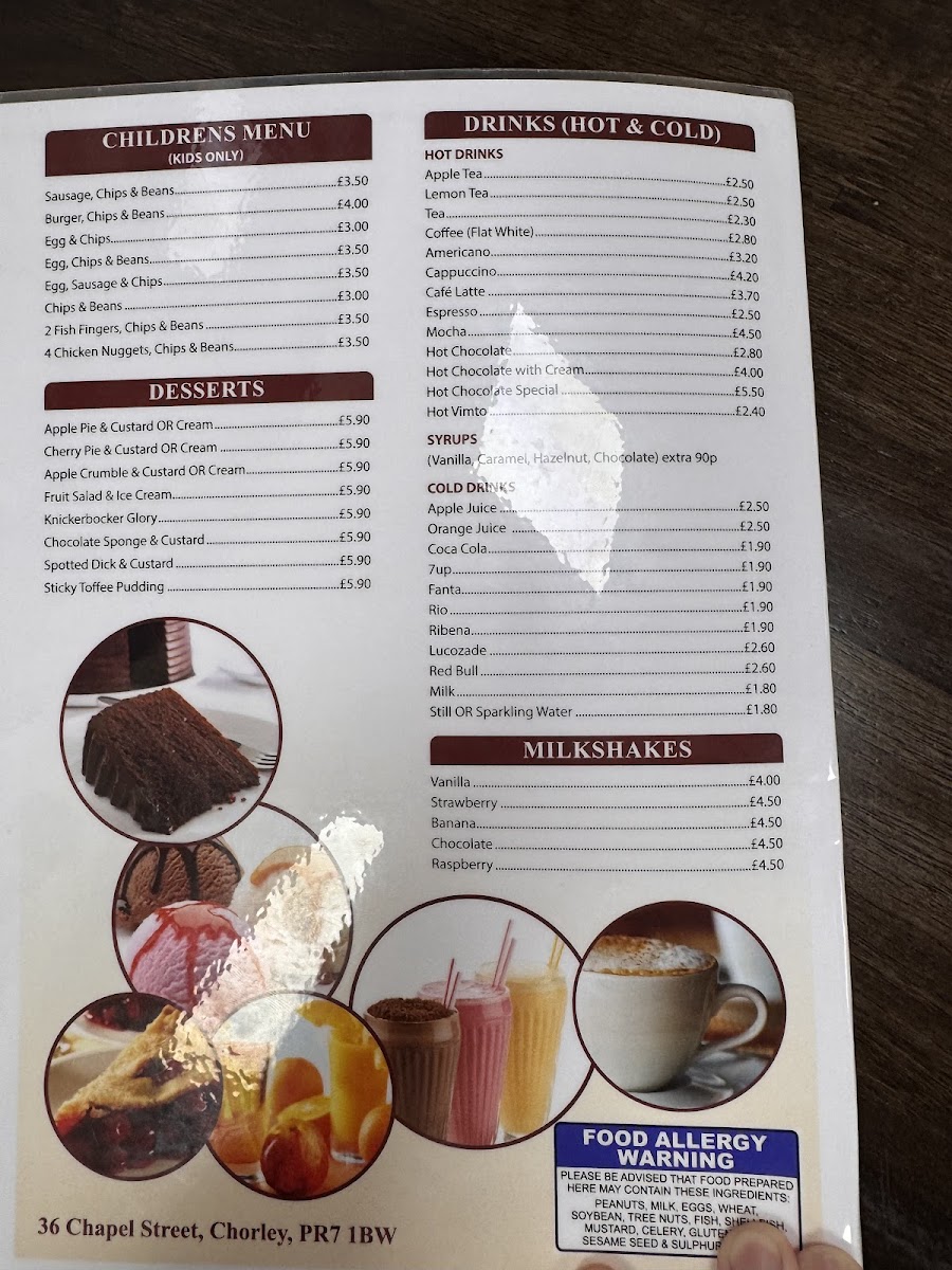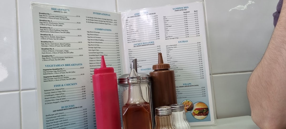 The menu at Chorley Town Cafe offers a wide variety of dishes, making it an appealing spot for breakfast, lunch, or a quick snack. For breakfast, you can choose from options like Breakfast No. 2, Breakfast No. 3, and Vegetarian Breakfast No. 2, with each offering a hearty selection of traditional items. The fish and chicken section includes comforting choices like Battered Fish, Chips & Peas and Chicken Kiev, Chips & Salad. For burger lovers, there are several varieties, including the Beefburger With Onions, Cheeseburger With Onions, and the larger King Size Burger With Onions. If you're in the mood for a combination, the Egg, Bacon & Sausage or Egg, Bacon & Beans are great choices. The jacket potatoes are also worth trying, with options such as Cheese, Beans, and Tuna Bolognese. Sandwiches like Bacon, Sausage, and Corned Beef provide a satisfying bite, while extras like Toasted Tea Cakes and Chips complement your meal. For something heartier, the Homemade Cheese & Onion Pie or Steak Pie served with chips or mash is perfect. Omelettes, toasties, and paninis are also available, with options like Ham & Cheese or Chicken & Cheese. If you're looking for something lighter, the salad choices, such as the Tuna Salad or Chicken Salad, are fresh and filling. The children’s menu offers simpler choices like Sausage, Chips & Beans or Burger, Chips & Beans. To finish off, you can enjoy a dessert such as Apple Pie & Custard or a Knickerbocker Glory. Hot drinks like Cappuccino or Café Latte, as well as refreshing cold drinks and milkshakes in flavors like Vanilla and Strawberry, round out the meal options. Whether you're after a full meal or a quick bite, Chorley Town Cafe's menu has something to satisfy every craving.