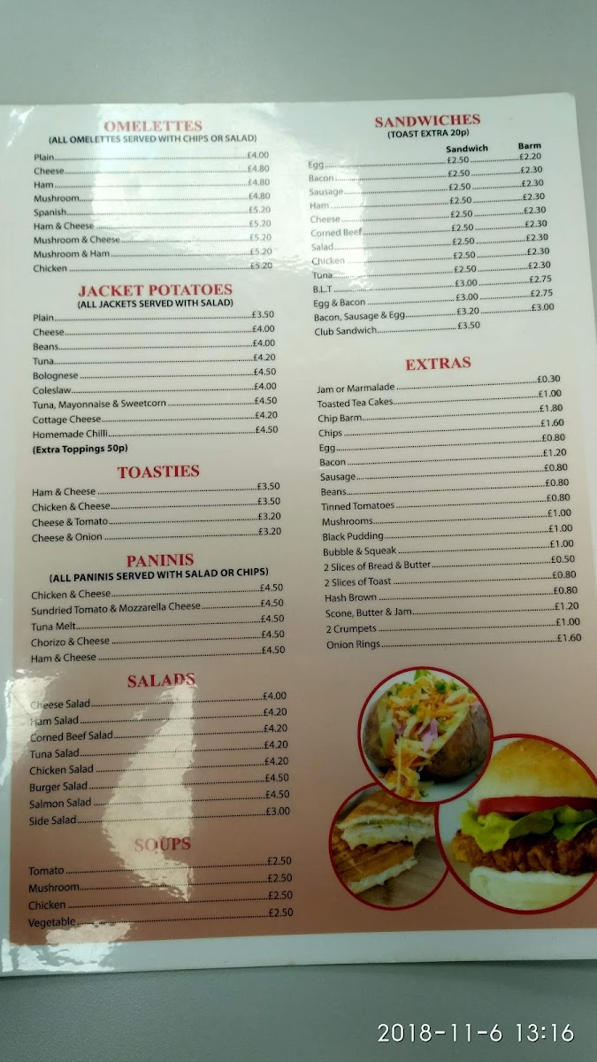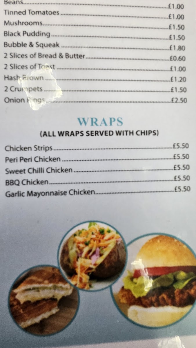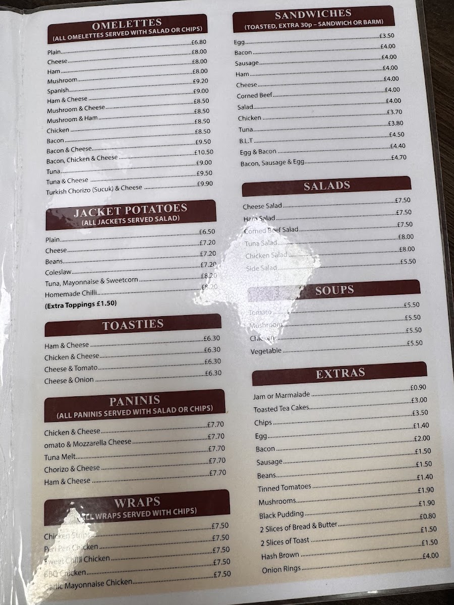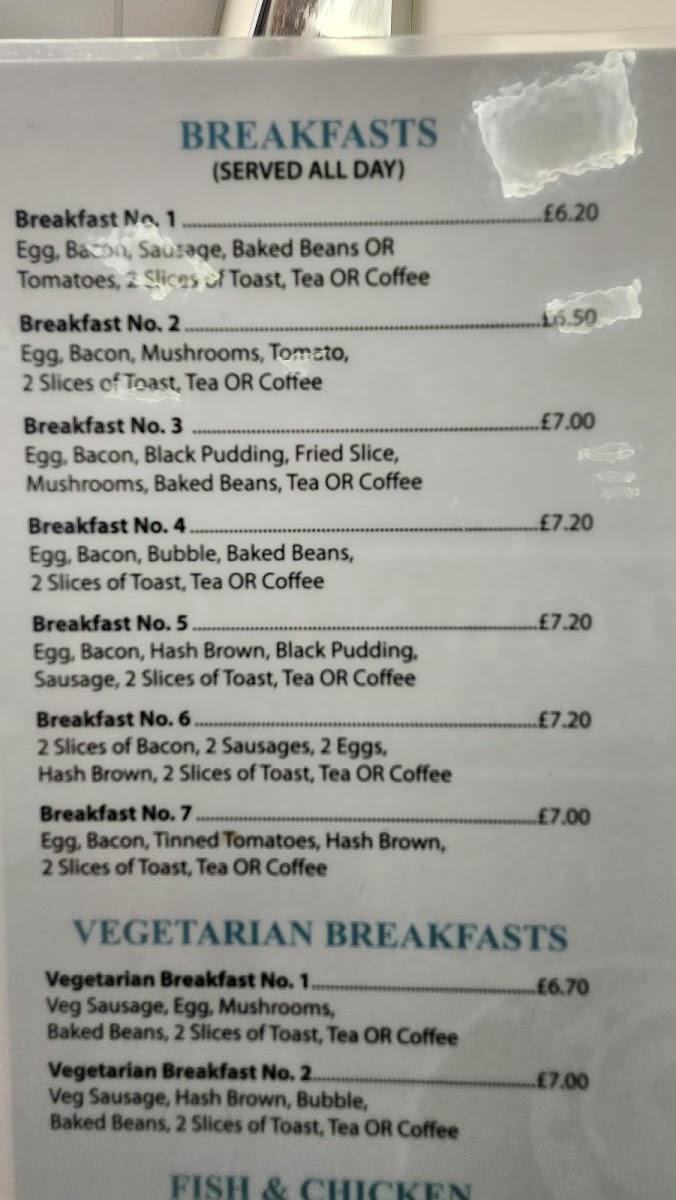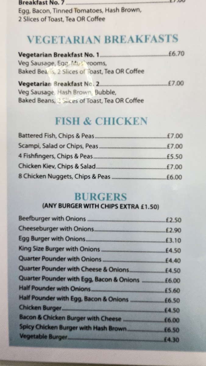 The menu at Chorley Town Cafe offers a wide variety of dishes, making it an appealing spot for breakfast, lunch, or a quick snack. For breakfast, you can choose from options like Breakfast No. 2, Breakfast No. 3, and Vegetarian Breakfast No. 2, with each offering a hearty selection of traditional items. The fish and chicken section includes comforting choices like Battered Fish, Chips & Peas and Chicken Kiev, Chips & Salad. For burger lovers, there are several varieties, including the Beefburger With Onions, Cheeseburger With Onions, and the larger King Size Burger With Onions. If you're in the mood for a combination, the Egg, Bacon & Sausage or Egg, Bacon & Beans are great choices. The jacket potatoes are also worth trying, with options such as Cheese, Beans, and Tuna Bolognese. Sandwiches like Bacon, Sausage, and Corned Beef provide a satisfying bite, while extras like Toasted Tea Cakes and Chips complement your meal. For something heartier, the Homemade Cheese & Onion Pie or Steak Pie served with chips or mash is perfect. Omelettes, toasties, and paninis are also available, with options like Ham & Cheese or Chicken & Cheese. If you're looking for something lighter, the salad choices, such as the Tuna Salad or Chicken Salad, are fresh and filling. The children’s menu offers simpler choices like Sausage, Chips & Beans or Burger, Chips & Beans. To finish off, you can enjoy a dessert such as Apple Pie & Custard or a Knickerbocker Glory. Hot drinks like Cappuccino or Café Latte, as well as refreshing cold drinks and milkshakes in flavors like Vanilla and Strawberry, round out the meal options. Whether you're after a full meal or a quick bite, Chorley Town Cafe's menu has something to satisfy every craving.